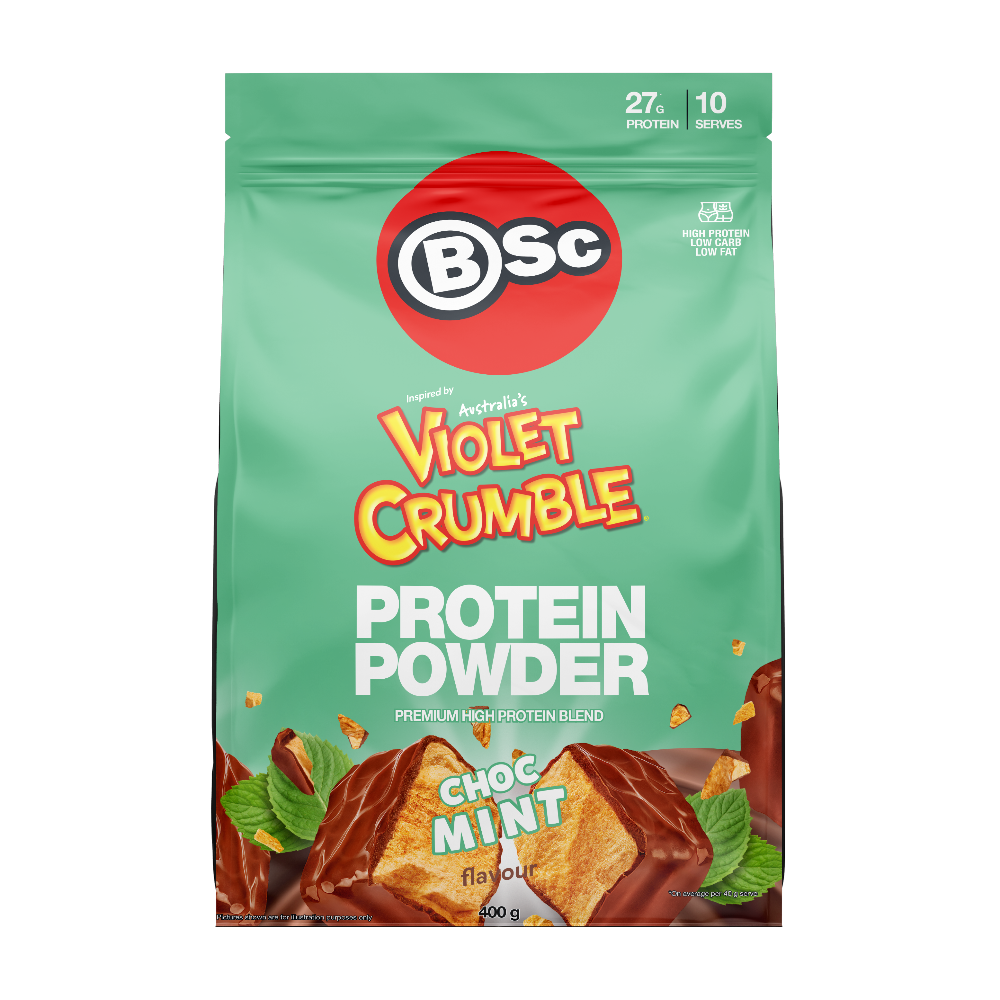 BSc x Violet Crumble protein powders offer 3 delicious high protein, low sugar choices to satisfy your sweet tooth. A tastier way to hit your macros and achieve your health and fitness goals.