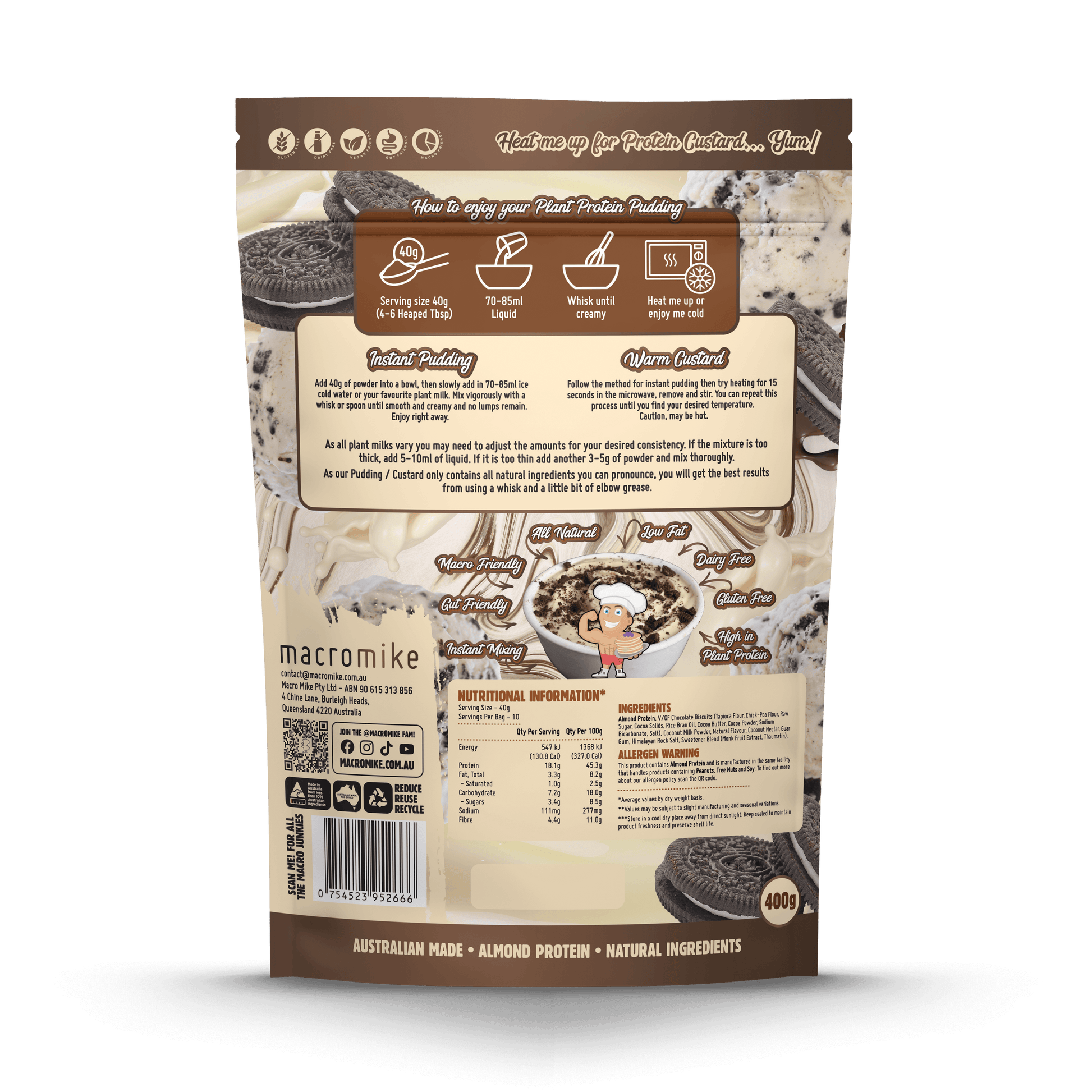 Are you tired of protein puddings that fall short on flavour and texture? We hear you! Most brands load up on fillers, dairy, or artificial additives that just don’t make the cut. That’s why Macro Mike was created—a game-changing range that brings you pure plant-based goodness without compromise. This pudding is smooth, rich, and ultra-creamy, perfect as a cold dessert or warm custard!